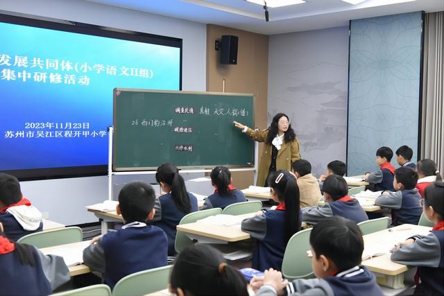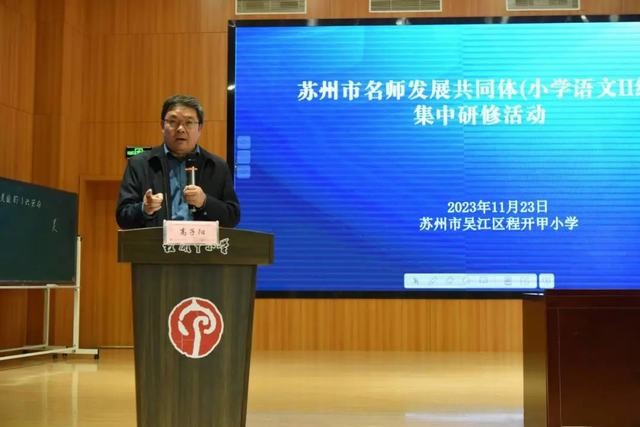 2023年11月23日,苏州市吴江区程开甲小学举行了苏州市名师发展共同体(小学语文Ⅱ组)集中研修活动。本次活动的主题为“语文学习任务群的单元整体教学研究”。来自苏州市名师发展共同体、薛法根小学语文名师工作室、沈玉芬小学语文名师工作室、吴江区初任校长培训班和吴江区小学语文新教师培训班的100多位老师参加了此次活动。