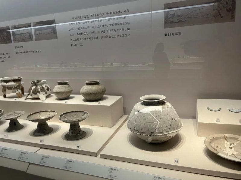 一幅幅山水图画,一件件陶瓷器皿,一个个经典故事……伴随着讲解员的讲解,同学们在苏州湾博物馆里开始了一次与历史的亲密邂逅,深入了解了家乡的历史变迁和文化传承。四楼的“吴韵江南”吴江历史文化陈列展让同学们多维度的了解吴江这个千年苏韵里的“乐居之城”。大家近距离地感受着浓郁的吴江地域文化特色,通过马家浜文化、崧泽文化和良渚文化三个时期的陶器,以及吴江地区史前文明陶器的历史简介,一起穿越时空,走进古代吴江人民的生产生活。