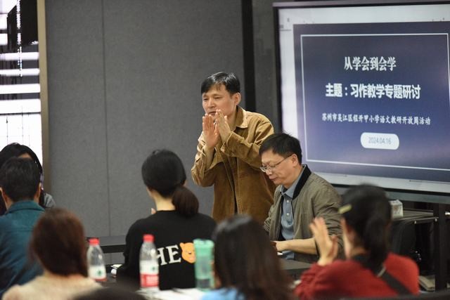 研讨时,邓老师提出了本节课上的不足之处以及自己的疑问,之后团队老师进行评课,指出可以先打开学生的习作思路,在特定场景中选择特定景物进行表达,课堂评价可以尽可能多样性。随后,江苏省特级教师管建刚进行点评,管老师从“摆正一个观念”出发,指出作文课不等于作文教学,之后提出了作文教学应解决的三个问题:为什么写?写什么?怎么写?老师的课堂不能仅停留在让学生“会了”,而要让学生形成习惯,教的少就能更好地实现“教学评”一致性。最后,薛法根校长结合《那个星期天》提出自己的看法,他指出作文教学就是让学生综合运用五种表达方式的练习,让老师们要跳出概念的泥潭,回归教学的本质形式。