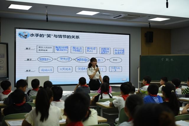 上午的活动分为汇报课展示和专家点评。重庆市两江新区星光教育集团的代璐老师执教五年级课文《跳水》,代老师逆向溯源,层层深入教学内容,从“推测孩子的思维过程,感受危险处境”和“推测船长的思维过程,感受船长智慧”两个方面进行深入探究,以小组合作学习的方式展开讨论,引导学生探究船长的思维过程。程开甲小学校长薛法根点评,薛校长认为课堂教学中能够运用多个角色交织进行叙述,能够抓住“情感的逻辑”的发展,梳理小说情节,而小组合作学习使用工具的介入,让成果能有效呈现。