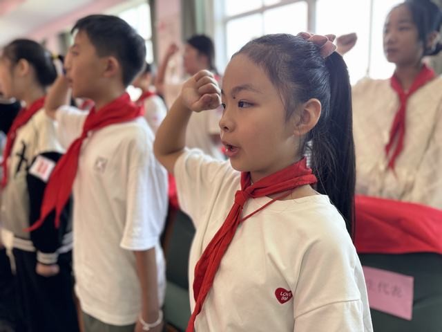 沈卫琴副主任宣布了程开甲小学第六届大队委成员的名单和职务,并授予他们大队干部的标志。随后,大队长带领新一届大队委成员进行了庄严的就职宣言,副大队长彭佳妮和大家分享了就职感言。最后,沈叶老师通过了程开甲小学东校区第一届少代会的决议,并带领大家进行呼号。