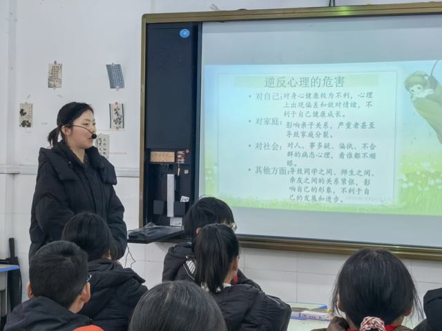 随后,老师借助生动的 PPT 演示,从心理学专业角度讲解逆反心理产生的根源,包括生理发育变化、自我意识觉醒、独立需求增长以及家庭与社会环境等多方面因素的交互影响。在理解根源的基础上,同学们进一步探讨了如何有效调适逆反心理,如:加强自我情绪管理、学会换位思考、积极沟通表达等实用方法。