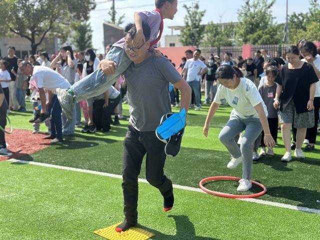 活动伊始,精彩纷呈的亲子活动在操场火热开展。在“信任之旅”环节,孩子们蒙住双眼,仅凭家长的语言指引在障碍路线中前行。过程中,家长们耐心引导,孩子们全神贯注;随后,角色互换,家长们蒙上眼睛,在孩子的带领下前进。每一次成功跨越障碍都引发阵阵欢笑与掌声,有效增进了亲子间的信任与默契。“转呼啦圈”环节,家长与孩子使出浑身解数,奋力比拼,展现出蓬勃的活力与竞争意识。而最具挑战性的“指压板挑战”将活动推向高潮,家长与孩子赤脚完成任务,有的家长和孩子一起快速奔跑,有的家长一手抱起孩子往前冲,有的家长迅速背起孩子大步向前。虽然脚下疼痛,但彼此鼓励的眼神与加油声,让现场充满温情。