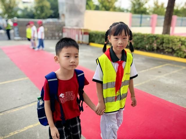 清晨的校门口,身着绿色马甲的少先队志愿者们早已整齐列队,眼神里满是期待。当背着小书包的一年级新生在家长陪伴下走来,志愿者们立刻上前,微笑着从家长手中郑重接过小朋友的手,轻声叮嘱:“别害怕,我带你去教室!”一路上,他们或分享校园小常识,或倾听新生的小小心声,欢声笑语中,稳稳牵着“小手”将学弟学妹们送到班级门口,为他们的小学生活之旅拉开温暖序幕。