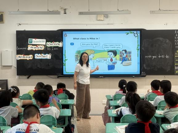 郭老师执教Unit 3 Are you Su Hai? Story time第二课时,借助节奏明快的chant儿歌让学生在肢体互动中复习身份询问句式,快速进入学习状态。同时回顾上节课Cartoon time内容,引导学生思考“如何了解新朋友”,自然衔接本课主题,为语篇学习做好铺垫。以Mike如何辨别Su Hai与Su Yang为主线,将语篇拆分为三个场景逐步推进。引导学生聚焦核心问题,帮助学生梳理人物身份、班级等关键信息;引导学生从文本走向生活,在实践中提升语言运用能力;并呼应本单元Big question,提高学生英语学习能力。
