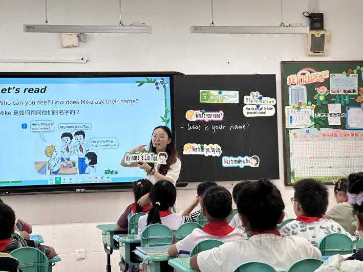 孙老师执教Unit2 What’s your name?的Story time部分,结合课文插图,展示新朋友见面的场景图,利用课文角色Mike和Yang Ling,讲解“新同学相识”的对话背景。随后,她请学生分别扮演课文角色,展开想象,引导学生用核心语句“Hello, I'm...”“What's your name?”“My name is...”进行自由实景交流。孙老师鼓励学生勇敢地开口说英语,在教室按小组模拟“认识新朋友”场景,鼓励大家结合自己的英文名开展对话。她穿梭在各小组间,及时纠正发音、调整表达语气。孙老师让学生在动态情境中运用知识,更直观地理解了对话逻辑,提升了语言运用能力。