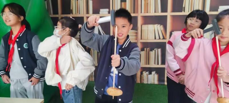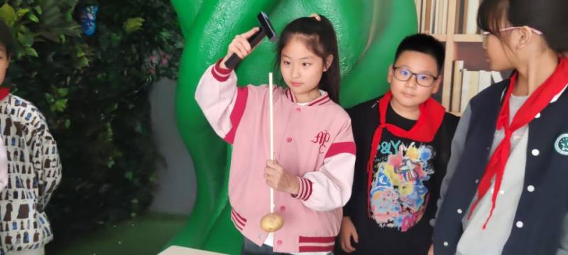活动现场,在老师的指导下,同学们纷纷拿起工具,将木棍穿过土豆。当用锤子向下敲打木棍时,奇妙的现象发生了,土豆竟然沿着木棍“向上爬”。同学们眼睛里闪烁着好奇的光芒,有的认真操作,有的相互交流讨论,现场氛围十分热烈。