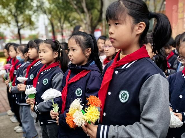 同学们排着整齐的队伍来到开甲爷爷雕像前,郑重宣誓,深切告慰程开甲爷爷,并将亲手制作的马兰花,,郑重地敬献于雕像前。