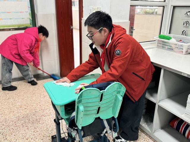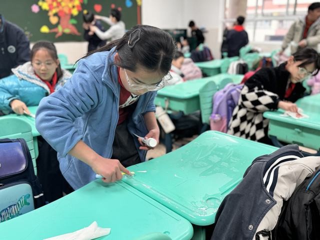 劳动中,同学们分工合作,有的踮起脚尖擦拭门窗玻璃,有的弯腰弓背清理墙角地面,有的细心整理图书角、讲台,还有的认真冲洗拖把、换水……大家不怕脏、不怕累,个个干劲十足,脸上洋溢着劳动的喜悦。老师们也全程参与,一边指导清洁技巧,一边与同学们并肩劳动,师生齐心,其乐融融。经过一节课的共同努力,教室窗明几净,桌椅排列整齐,校园绿意盎然,整个校园焕发出清新亮丽的光彩。